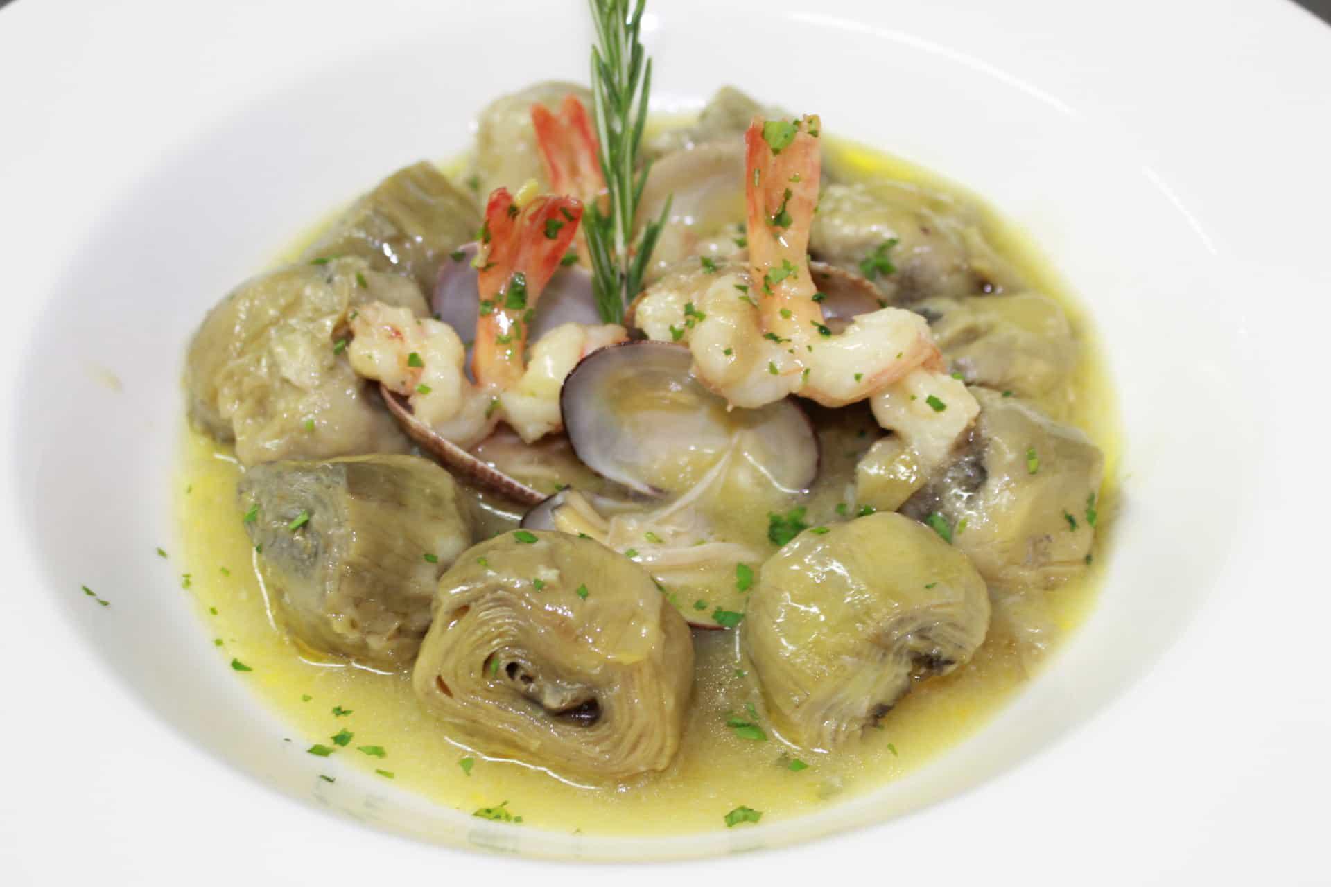 Preparación: limpias las alcachofas y desprovistas de las hojas externas, se cuecen en agua con sal y un poco de zumo de limón. Ya cocidas, se retiran y reservan. Aparte, según costumbre, se preparan unas almejas a la marinera. Seguidamente se rehogan las alcachofas con aceite y ajos muy picados, se mezclan con las almejas y se añade un poco de caldo de pescado o agua de cocción de las alcachofas; hierve unos momentos para que ligue la salsa y se sirve muy caliente.